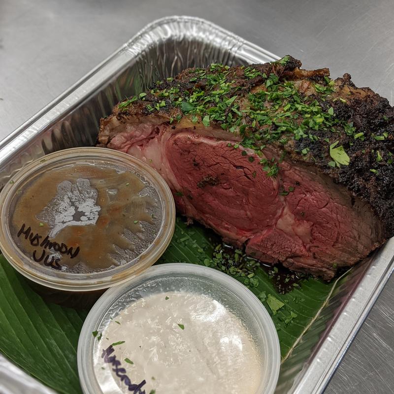 kiawe wood smoked air dried rib eye, Hawaiian salt, fresh herbs, garlic, natural aus jus, wasabihorseradish sour cream
