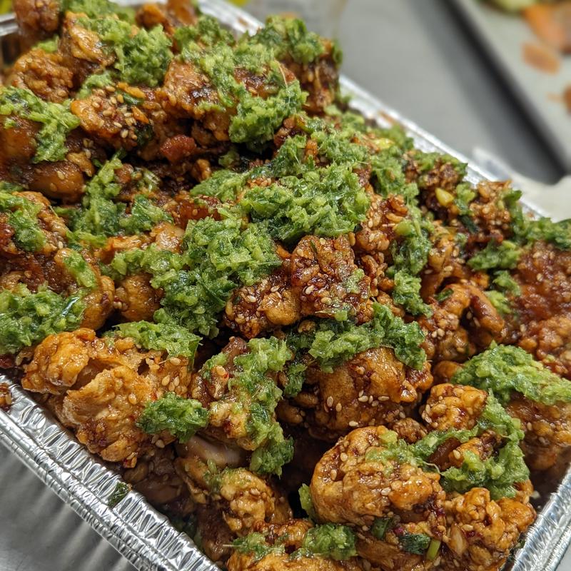 SP $75.00 | LP $190.00 • Fried boneless chicken, sesame garlic glaze, ginger scallion.